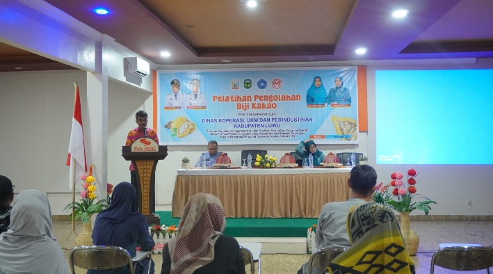 SATUDATA.co.id | Luwu — Pemerintah Kabupaten Luwu melalui Dinas Koperasi, UKM dan Perindustrian (DKUP) menggelar Pelatihan Pengolahan Biji Kakao di Aula Hotel Belia, Belopa, Kabupaten Luwu, Sulsel Jumat (28/11/2025).
