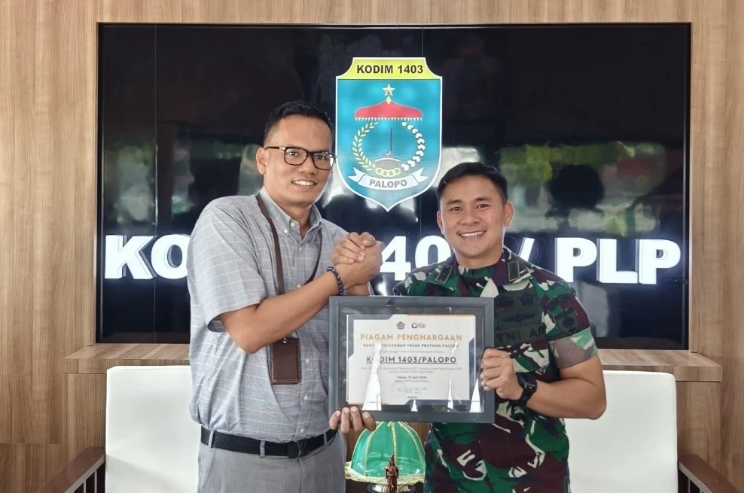 Penghargaan tersebut diserahkan langsung oleh Kepala KPP Pratama Palopo, Nelson, kepada Komandan Kodim 1403 Palopo, Letkol Inf Windra Sukma Prihantoro, di lobi Markas Kodim 1403 Palopo, Jalan Pattimura, Kota Palopo, Kamis (16/4/2026).