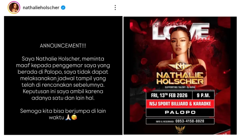 ” ANNOUNCEMENT!!!  Saya Nathalie Holscher, meminta maaf kepada penggemar saya yang berada di Palopo, saya tidak dapat melaksanakan jadwal tampil yang telah di rencanakan sebelumnya. Keputusan ini saya ambil karena adanya satu dan lain hal. Semoga kita bisa berjumpa di lain waktu,” demikian tulisan dari postingan akun Instagram @nathalieholscher