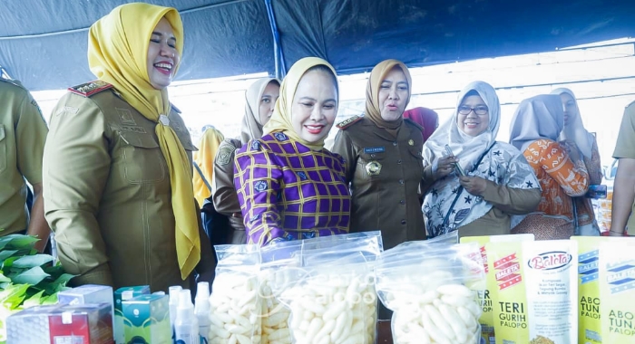 Wali Kota Palopo, Hj. Naili Trisal, meninjau stan pelaku UMKM lokal pada kegiatan Gerakan Pangan Murah (GPM) di Halaman Kantor Wali Kota Palopo, Senin 13/10/2025. Foto : Pemkot Palopo