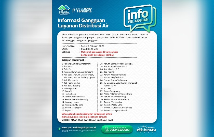 SATUDATA.co.id | Palopo – Perusahaan Umum Daerah Air Minum (Perumda) Tirta Mangkaluku Kota Palopo mengumumkan akan melakukan pembersihan atau pencucian Water Treatment Plant (WTP) IPAM 5 Batupapan pada Senin, 2 Februari 2026 Besok.