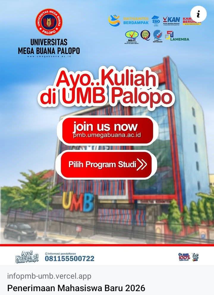 SATUDATA.co.id | Palopo — Universitas Mega Buana Palopo (UMB) resmi membuka Penerimaan Mahasiswa Baru (PMB) Tahun Akademik terbaru, sebagai upaya menjawab kebutuhan pendidikan berkualitas di tengah persaingan dunia kerja yang semakin kompetitif.