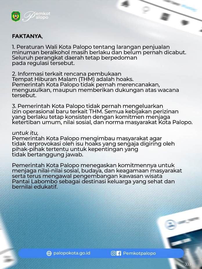 2. Informasi terkait rencana pembukaan Tempat Hiburan Malam (THM) adalah hoaks. Pemerintah Kota Palopo tidak pernah merencanakan, mengusulkan, maupun memberikan dukungan atas wacana tersebut.