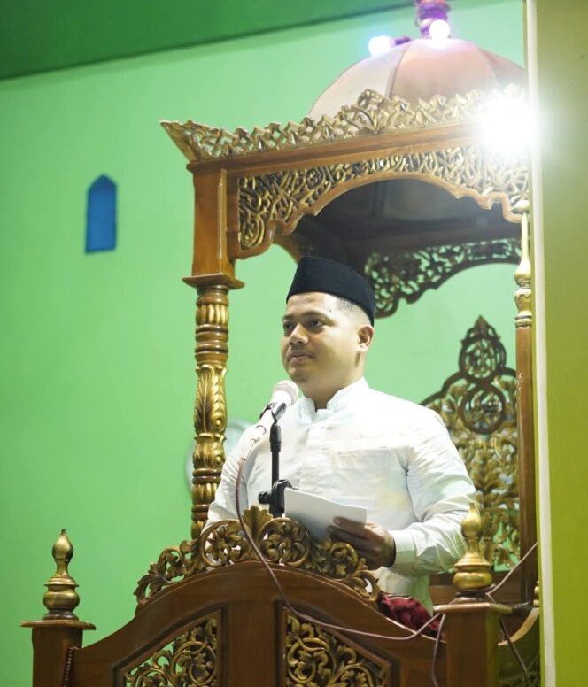 Wakil Bupati Luwu Muh. Dhevy Bijak Pawindu, membacakan sambutan di hadapan ratusan jamaah Masjid Al Mawasir, Desa Batusitanduk, Kecamatan Walenrang, Kamis (19/2/2026). Foto: Ist